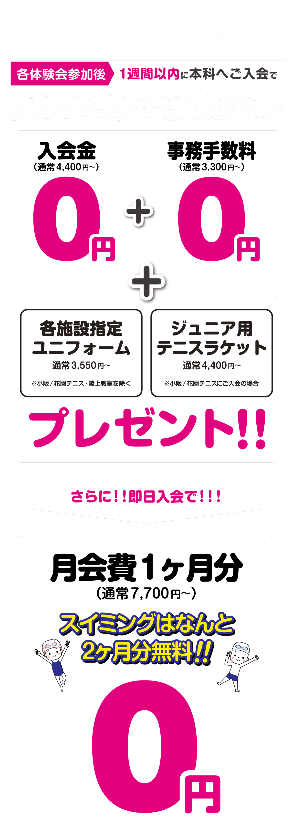 新しいことにチャレンジさせてあげたい!とお考えの方、まずは体験をしてみませんか?HOS小阪ジュニアスクール・花園スタジアムでは、5月14(日)〜6月30日(金)まで、『初夏の体験会』を開催します!ぜひお気軽にご参加ください!さらに今なら体験会参加後のご入会でお得な特典も。こちらも要チェックです!